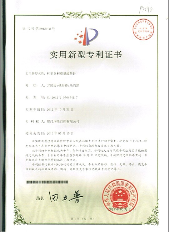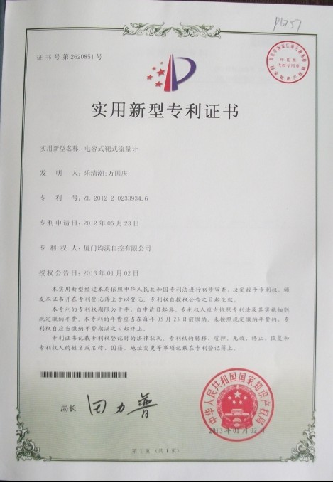 靶式流量計(jì)專利證書